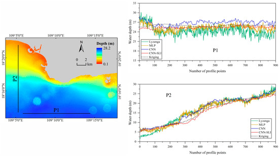 As can be seen from Figure 10, the water depth profile results of the four inversion models have roughly the same trend as the Kriging interpolation results. Among them, the profile line trend of the CNN-SLI model is closest to the Kriging interpolation results. In the P1 profile, the profile line trends of the Lyzenga, MLP, and CNN models at the first 100 points show large differences compared with the Kriging interpolation results. Specifically, for the water depth estimates of the first 100 points, all three models show a tendency to overestimate. However, the trend of the CNN-SLI model in the same profile interval is closer to the Kriging interpolation result. Furthermore, in the P1 profile, the CNN model begins to overestimate the water depth value after the 250th point, while the Lyzenga model begins to underestimate the water depth value after the same position. On the contrary, the profile trend of the MLP and CNN-SLI models after the 250th point is closer to the Kriging interpolation result. It is worth noting that throughout the P1 profile, the profile lines of the Lyzenga and MLP models exhibit larger fluctuation amplitudes than the CNN and CNN-SLI models. In the P2 profile, the Lyzenga, MLP, and CNN models all overestimated the water depth value in the profile interval from the 250th point to the 600th point. The Lyzenga model also showed a trend of underestimating the water depth in the first 100 points. Only the CNN-SLI model had a trend in line with the kriging interpolation results throughout the P2 profile. Notably, the CNN and CNN-SLI models exhibit similar fluctuation amplitudes in the P2 profile, which are smaller than those of the Lyzenga and MLP models. This analysis of water depth profiles highlights the exceptional performance of the CNN-SLI model in nearshore waters, as it closely aligns with the Kriging interpolation compared to the Lyzenga, MLP, and CNN models.