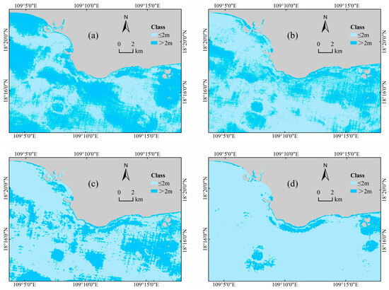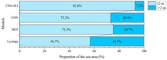 To assess the performance of different models in water depth inversion, we also obtained the discrepancy values between the inversion results of these models and the Kriging interpolation results of the measured water depth points. The results are presented in Figure 11 and Figure 12. The discrepancy ranges of the models were compared using 2 m as the threshold. Dark blue areas indicate discrepancy values greater than 2 m, while light blue areas indicate values less than or equal to 2 m. The findings reveal that the CNN-SLI model stands out, with only 7.2% of the sea area range in large discrepancy values, which is significantly lower than the Lyzenga, MLP, and CNN models (43.3% for Lyzenga, 24.7% for MLP, and 26.8% for CNN). Therefore, through a comprehensive comparison of discrepancy maps between the inverted water depth of different models and the interpolated water depth, it is evident that the CNN-SLI model’s inverted water depth is closer to the Kriging interpolated water depth than the Lyzenga, MLP, and CNN models, indicating its superior performance.