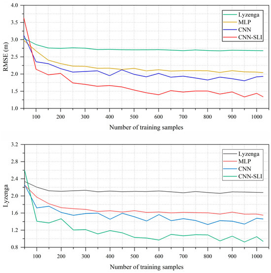 As depicted in Figure 13, the inversion errors of the Lyzenga, MLP, CNN, and CNN-SLI models decrease significantly as the number of training samples increases until it reaches 150, 150, 100, and 250, respectively. However, the reduction effect becomes relatively limited as the number of training samples continues to increase. It is worth noting that the inversion error of the CNN and CNN-SLI models changes more with the number of training samples than that of the Lyzenga and MLP models, but when the number of training samples is not less than 100, the inversion errors of the CNN and CNN-SLI models are always lower than those of the Lyzenga and MLP models. When the number of training samples is no less than 100, the CNN-SLI model has the lowest inversion error among all models. All in all, in this study area, when the number of training samples is no less than 250, the performance advantages of the CNN-SLI model can be fully utilized, and the CNN-SLI model has the best inversion effect among all models.