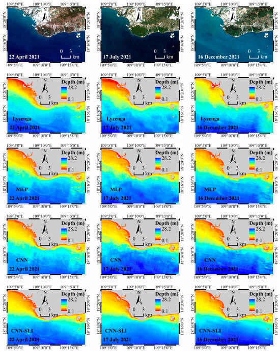 It can also be seen from Table 5 that for processing a GF-6 image (size: 1561 × 1118), the comparative results of the time required by each model are as follows: Lyzenga (2.44 s) < MLP (66.89 s) < CNN (112.12 s) < CNN-SLI (237.84 s). The CNN-SLI model has the longest running time, but this is not an obstacle to the application and promotion of the algorithm because, in some real scenarios, the importance of inversion accuracy may be greater than the running efficiency of the algorithm.