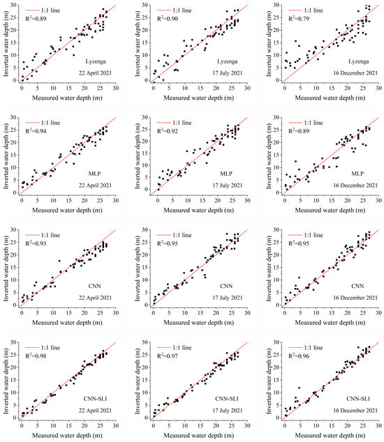 Figure 8 also illustrates the scatter distributions, providing further insights. It is obvious from the scatter distribution that the CNN-SLI model exhibits a higher degree of aggregation than the CNN, MLP, and Lyzenga models in different water depth ranges. Specifically, in the water depth range of 0–14 m, the CNN-SLI model shows the highest degree of aggregation, with most checkpoints distributed on both sides of the 1:1 line. In contrast, the CNN model has a significantly lower aggregation degree, while the MLP model has a lower aggregation degree than the CNN model but significantly higher than the Lyzenga model. In the water depth range of 14–21 m, the CNN-SLI model still maintains the highest aggregation degree, while the aggregation degrees of the Lyzenga, MLP, and CNN models are relatively close. In the water depth range of 21–29 m, the CNN-SLI model also shows the highest degree of aggregation, which is significantly better than the other three models, while the degree of aggregation of the CNN model is slightly lower than the MLP model but significantly higher than the Lyzenga model.