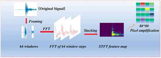 In this study, each AE signal was sampled with 2048 points. To achieve a balance in resolution, a window length of 64 with a 50% overlap was selected. The frequency spectrum length was set to 64, and a Hanning window was applied to mitigate the edge effects [28]. By concatenating the spectra of all windows, a feature map with dimensions of 65 × 65 was obtained, as illustrated in Figure 2. Additionally, to accommodate the feature input of the convolutional neural network, the feature map was resized to 80 × 80.