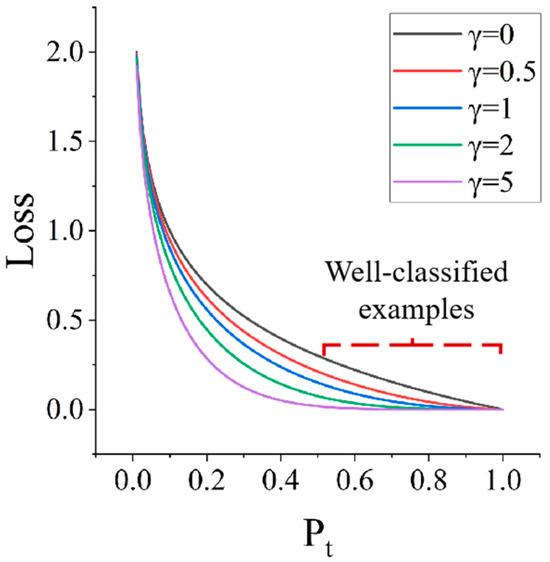 Here, (1 − Pt)γ is a regulator and γ ≥ 0 is an adjustable focus parameter. The following figure shows the γ ∈ [0, 5] Focal Loss curve at different values. When γ = 0, Equation (4) degenerates into the balanced Cross-Entropy Loss Function (Equation (3)). In the experiment, α is the value selection, which can be adjusted appropriately according to the actual situation. In this paper [39], it is considered that when γ increases α, it needs to be reduced appropriately, and the best effect is obtained at γ = 2, α = 0.25, so this value can be used as a general application.