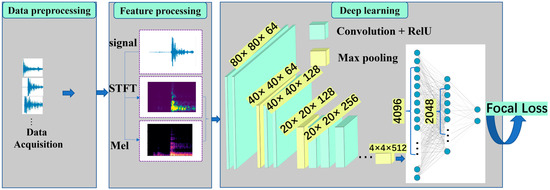 In this study, we utilize the VGG16 [38] deep learning network architecture, which consists of 13 convolutional layers, 5 pooling layers, and 3 fully connected layers. The convolutional kernels in each layer have a size of 3 × 3, and the pooling layers have a size of 2 × 2. VGG16 is widely acclaimed for its advantages, such as a smaller kernel size, fewer parameters, and powerful non-linear fitting capabilities. To adapt the VGG16 architecture to spectrogram data in this study, some modifications have been made. The improved structure is shown in Table 1.