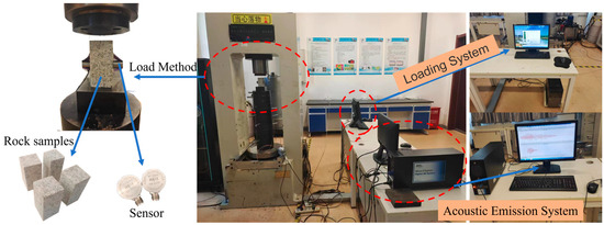 The experimental setup, as illustrated in Figure 7, utilized the TAW-3000 servo-controlled rock mechanical testing system. This system had a maximum axial load capacity of 3000 kN and a horizontal stress load capacity of 1000 kN, with a loading accuracy error that did not exceed 1%. The acoustic emissions system employed the high-performance PCI-2 acoustic emission monitoring systems from a renowned acoustic company in the United States. It allowed simultaneous data acquisition from up to 16 signal channels. The real-time processing of acoustic emission characteristics on each channel was performed using FPGA hardware, enabling high-speed signal processing. This system featured a 40 MHz, 18-bit A/D converter for real-time analysis and provided precise signal processing capabilities. In an acoustic emissions system, setting a sampling rate of 1 MHz represented the sampling rate of 1 M points per unit of time, which could be understood as the sampling speed. This experiment is set at 1 MHz. According to the sampling theorem [46], the maximum frequency of the signal should not exceed half of the sampling rate, and the sampling value can contain all the information of the original signal. This means that the high-frequency signal cannot exceed 500 kHz, which is the highest frequency in the STFT spectrum in this article.