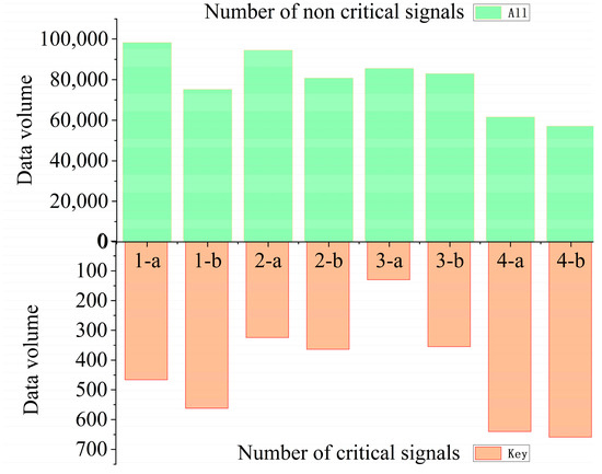 The collected signal datasets are presented in Table 3, which provides information on the total data volume as well as the quantities of baseline key signal data and non-key signal data obtained based on the energy contribution rate [17]. The table comprises 8 sets of acoustic emission data collected from 4 granite specimens using a dual-channel acquisition setup. At the same time, in order to better reflect the signal quantity distribution, a column diagram for the comparison of the upper and lower Y-axes is drawn on the basis of Table 3 to represent the overall distribution of the number of key signals and non-key signals in the same group of tests, as shown in Figure 8.