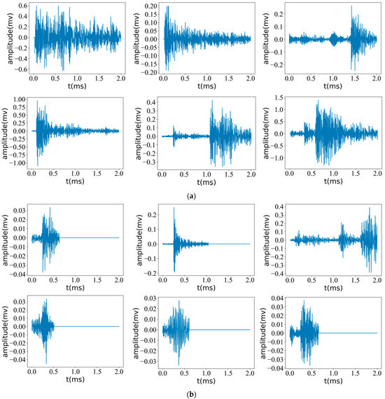 Data preprocessing plays a crucial role in eliminating low-energy weak signals with distinctive waveform features prior to feature extraction, as illustrated in Figure 10, which showcases a subset of acquired acoustic emission signal waveforms in the experiment. Through the careful comparison and analysis of these waveforms, it becomes apparent that low-energy weak signals often exhibit a characteristic of zero amplitude toward the end. This characteristic is mathematically represented by the following formula.