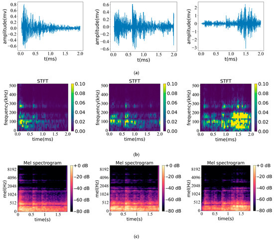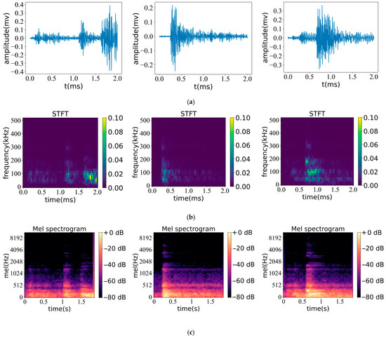 Figure 11 and Figure 12 depict the results of the STFT and Mel spectra obtained from two different acoustic emission signals in the experiment. From the analysis of the signal waveform, it can be observed that the highest amplitude of the three noncritical signals in Figure 11a is about 0.4 mv. Compared to Figure 11a, the high amplitude of the critical signal in Figure 12a is about 0.8–2 mv. Therefore, compared to the critical signal, the overall amplitude of the noncritical signal is usually lower.