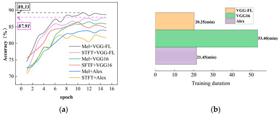Figure 13a depicts the accuracy curves of the six models on the validation set as the number of training iterations increases. It is evident that the Mel+VGG-FL model demonstrates a rapid convergence, reaching a plateau of approximately 89.3% in accuracy after 15 epochs. The final accuracy remains stable at around 87.91%, indicating that the Focal Loss technique effectively enhances the overall accuracy of the samples, even in the presence of imbalanced data. On the other hand, the accuracy curve of the Alex model exhibits a relatively lower performance with slight fluctuations. This analysis suggests that VGG16 outperforms Alex in terms of faster convergence and higher accuracy, owing to its utilization of smaller convolutional kernels, reduced parameter sharing, deeper network architecture, and improved initialization strategies.