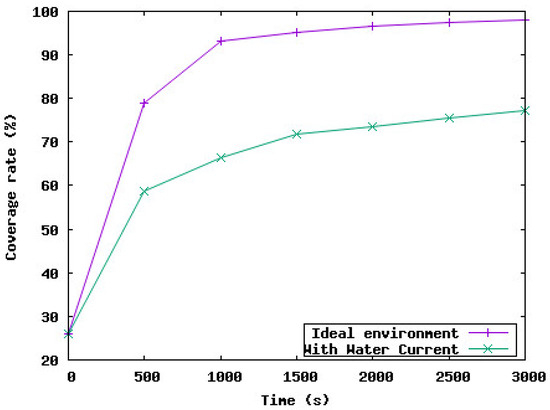 Our target in this section is first to show the self-adjustment deployment algorithm’s performance in terms of coverage rate and then to study the effect of the water currents on the energy dissipated during the deployment phase.