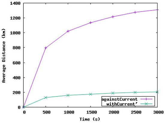 As explained in [31], the water currents velocity is a horizontal force that changes with the depth. In our simulation, we considered the example of the Gulf Stream which is an intense, warm ocean current in the western North Atlantic Ocean. It moves north along the coast of Florida and then turns eastward off of North Carolina, flowing northeast across the Atlantic. The velocity of the Gulf Stream current is fastest near the surface. Its average speed is 6.4 km per hour, and its maximum is 9 km per hour [12,35]. Based on this, we varied the water currents with the depth from 2 m/s to 0.5 m/s, and the direction of the currents is equal to 0.