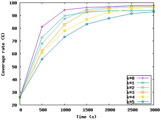 In the following, we study the effect of delaying some node displacements if the work is negative on the network performance in terms of coverage rate, the time needed to reach this rate, and the distance traveled by nodes during the deployment. k represents the number of consecutive times a node must wait if the work is negative. In the following simulation series, we varied k from 0 to 5. means the node should move immediately to the new position and should not wait, even if the work is negative. means the node can wait maximum i iteration(s) if the work is negative.