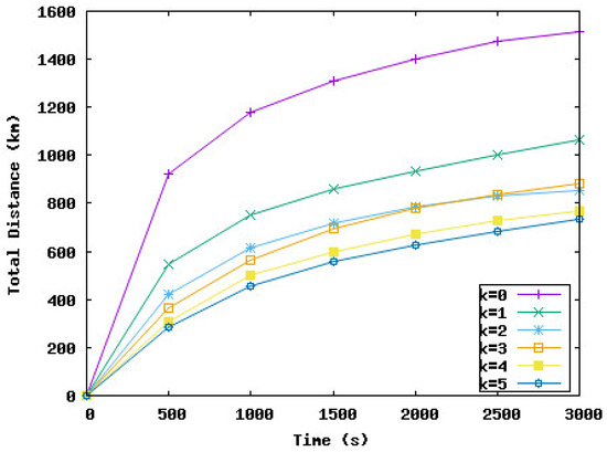 Total distance traveled by the underwater sensor nodes against the water currents with different values of k.