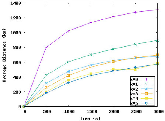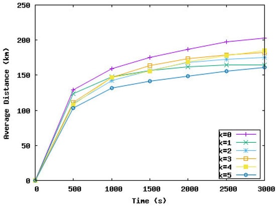 Figure 9, Figure 10, Figure 11 and Figure 12 present the coverage rate, total distance traveled by the underwater sensor nodes against the water currents, average distance traveled by the underwater sensor nodes against the water currents, and average distance traveled by the underwater sensor nodes with the water currents, respectively, while varying k from 0 to 5.