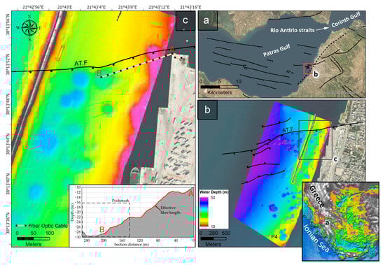 The site for the DTS deployment was chosen based on the geological settings in the area and the safety of the system during operation. Based on previously acquired geophysical data [], a specific pockmark, located at the shallowest part of a pockmark string aligned with the Agia Triada fault (AT.F) inside the Patras harbor, was selected for the deployment of the DTS (Figure 1c). The selected site appears particularly favorable for the DTS deployment and monitoring for the following reasons: (i) the depth is shallow enough (<30 m) and close to the coast to ensure a safe deployment/recovery task; (ii) the fiber cable is running almost parallel and very close to the trace of the active fault of Ag. Triada (AT.F), which has likely been activated in the 1993 earthquake; and (iii) the fiber optic terminates inside a shallow pockmark having a diameter of about 100 m and a relative depth of 22–30 m, in which gas flaring had been recorded in the 1993 earthquake []. The fiber had an active bottom length of 200 m, with its last 60 m located inside the pockmark and ending close to its deepest point (see bathymetric section in Figure 1c).