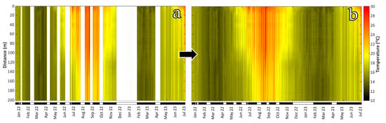 The sampling interval of the DTS was set to 0.5 m in the longitudinal dimension and 30 s in the time domain, permitting 400 times and range-averaged temperature measurements per 30 s. An XML file was stored per 30 s, containing the 400 longitudinal temperature measurements for the regarded timeframe. A dedicated MATLAB routine to read the XML files, time-tag them, and sequentially merge all time-averaged longitudinal samples together in a uniform database was created. The dataset considered in the current work refers to a period of 1.56 years (1,613,880 time-averaged samples × 400 longitudinal samples = 645,552,000 actual samples) between December 2021 and July 2023. Due to the inherent difficulties of the installation, corrupted or lost data were frequently induced, mostly due to instrument malfunctions and maintenance activities, resulting in data gaps, as presented in the time vs. fiber-length temperature plot of Figure 2a.