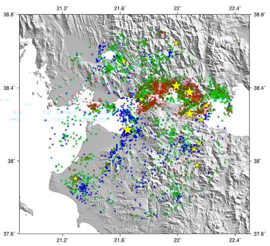 - Duverger, C.; Lambotte, S.; Bernard, P.; Lyon-Caen, H.; Deschamps, A.; Nercessian, A. Dynamics of Microseismicity and Its Relationship with the Active Structures in the Western Corinth Rift (Greece). Geophys. J. Int. 2018, 215, 196–221. [Google Scholar] [CrossRef]