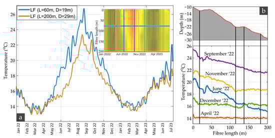 To explore the effect of the normal water column temperature change with depth, a comparison between DTS profiles across the entire fiber cable is visualized in Figure 4b for a selection of five different time points. A strong correlation between depth and seabed water temperature is evident, especially during the summer and autumn. This is particularly apparent in the November, December, and June profiles of Figure 4b, where clear breakpoints are apparent around the 120 m fiber length point. This is expected due to the normal seasonal temperature gradient and thermocline formulated during those seasons in the area (summer temperature profiles can be found in []).