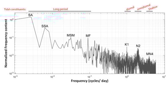 The CLEANed frequency spectrum of the seabed water temperature time series close to the pockmark center (200 m longitudinal sample along the fiber). The major tidal harmonic constituents detected are indicated. Both the x and y axes are on a logarithmic scale.