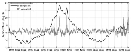Combined time series plot of the low frequency (LF) and high frequency (HF) components of the seabed water temperature signal at the end of the fiber (200 m longitudinal sample). LF and HF correspond to low and high-frequency components of the CLEANed signal, below and above 1 cycle/day frequency thresholds, respectively.