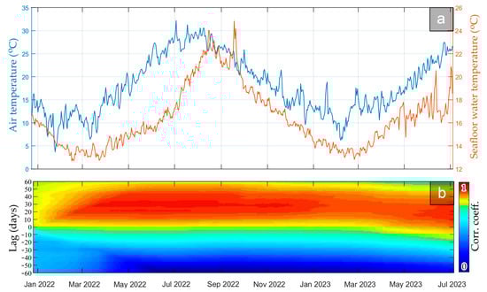In Figure 7a, the atmospheric temperature is compared against the seabed water temperature in the pockmark during the monitoring period. Application of the windowed cross-correlation exhibited a 20–30 day time lag between them, indicating that the seafloor water temperature reaches its maximum about a month later than the atmosphere’s. This is normal, as the heat flux equilibrium between solar radiation, longwave radiation, latent heat, and sensible heat, combined with vertical mixing and horizontal advection, allows heat storage to be maximized in the water column later than in the atmosphere.