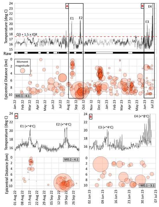 To specify events of irregular temperature time series, any outlier has been detected using the interquartile range (IQR), i.e., the range of the middle half of the statistical distribution of the dataset, and the outliers were defined as any values that fall outside this range. IQR is the range between the first and third quartiles (IQR = IQ3 − IQ1), while the highest bound of regular data, over which any sample is considered an outlier, is estimated as Q3 + 1.5 × IQR []. Any temperature even higher than this threshold has been indicated as an event (E#) and was compared against the magnitude, depth, and epicentral distance of the earthquakes that occurred during and around the corresponding time periods (see Section 4.4).