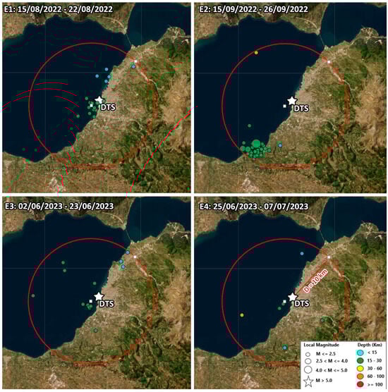 The seismicity in the Patras Gulf area during the four detected seabed water temperature high events (E1–E4, see Figure 8). Dots represent earthquake epicenters during the time period indicated in the upper right corner of each sub-map. Dot colors indicate the focal depth of each earthquake, while dot sizes correspond to their local magnitude (in the Richter scale).