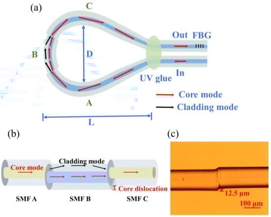 To fabricate the balloon-shaped core-offset bending SMF fiber structure shown in Figure 1, two core-offset structures were fabricated on SMF (Corning SMF-28, New York, NY, USA) using a commercial fiber fusion splicer (Fujikura-88S, Tokyo, Japan). The direction between the two COJ-based structures are irrelevant, which simplifies the production process. The two COJ-based structures have an offset of around 12.5 μm. Figure 1c depicts the microscopic view of a single offset core structure. The bending radius R of the fabricated sample is 12.83 mm to obtain the best interference deflection extinction ratio, and the corresponding width of the balloon-shaped section L is 65.92 mm. FBG is connected in series with the fiber structure.