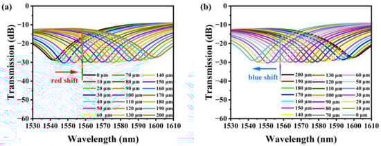 The transmission spectrum of the fiber structure varies when the displacement is between 0–200 μm and the step size is 10 μm. In order to evaluate the repeatability of the sample sensor, the displacement is decreased from 200 μm to 0 μm and the measurement process is performed in reverse. The results are displayed in Figure 3b. As depicted in Figure 3a, when the displacement increases, the inclination angle at 1540.14 nm is red-shifted, while the inclination extinction ratio remains nearly unchanged. As depicted in Figure 3b, the spectral evolution is reversed when the displacement direction changes. Due to the peculiarity of the Bragg grating resonance wavelength, when the displacement varies, the wavelength of dip B remains unchanged at 1558.14 nm. The variation in the dip A wavelength is due to the form change of the balloon-shaped cross section produced by displacement, which ultimately results in the variation of the effective bending length reff and the variation of optical coupling between the SMF core and cladding. During the experiment, the inclination extinction ratio will fluctuate slightly due to shifts in temperature, humidity, etc.