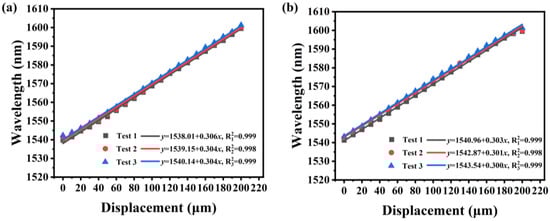 The wavelength shift and intensity change of dip A with increasing and decreasing displacement are linearly fitted in Figure 4a,b, respectively. The wavelength-displacement sensitivity of dip A to the displacement-increasing process may be computed from Figure 4a as reaching 0.306 nm/μm, and the linear regression coefficient (R2) achieves 0.999. The sensitivity of dip A to the displacement-reduction procedure can approach 0.303 nm/μm, and R2 is 0.999, as can be seen in Figure 4b. This sample also demonstrates that there is almost no hysteresis in the sensor and that the displacement measurement has good repeatability: the outcomes of three separate experiments are virtually identical.