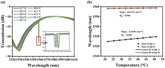 In addition to measuring displacement, the temperature dependence of the pro-posed fiber structure was investigated by placing the sensor sample on a heating plat-form. The temperature measurement range is 21.7–51.2 °C due to the limited operating temperature range of the UV glue. The transmission spectrum of the sensor changes when the temperature changes, as shown in Figure 5a. Redshift happens as dips A and B both drift to longer wavelengths as the temperature rises. Figure 5b depicts the displayed and fitted measured data. According to the findings of the linear fitting, dip A generated by MZI has a temperature sensitivity of 0.165 nm/°C, and dip B induced by FBG has a temperature sensitivity of 0.017 nm/°C, with R2 values of 0.995 and 0.990, respectively. It is worth noting that dip A in this structure has a temperature sensitivity that is 9.47 times greater than dip B, indicating that the MZI interference caused by the curved offset core structure is temperature-sensitive.