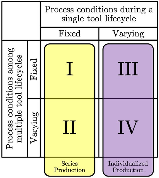 Their underlying production scenarios and datasets are the most significant distinguishing characteristics of the prediction models. A remaining tool life dataset comprises the sensor and target data over the life cycle of multiple tools. Possible variants of datasets are shown in Figure 1, depending on the respective degree of process condition variations during single and multiple tool life cycles. Process conditions refer to influencing factors, i.e., the tool shape and material; workpiece shape and material; cutting parameters; machine tool design and its condition or tool path; and process kinematics. While the dataset variants I, e.g., Ref. [23], and II, e.g., Ref. [24], mainly represent series production, the combinations III [25] and IV describe the individualized production scenario.