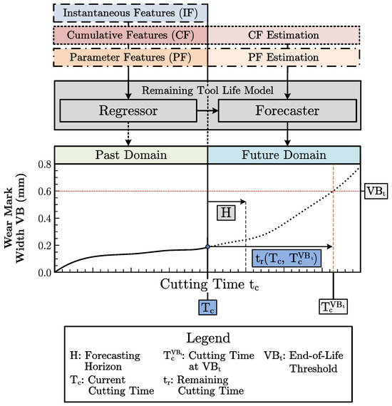 The goal is to predict at the current cutting time step the future time step where the wear threshold value is reached. The remaining tool life can then be derived according to Equation (1):