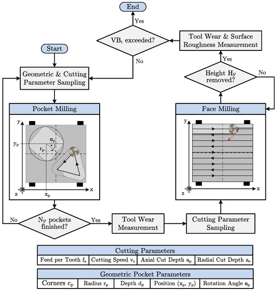 A fixed number of pocket geometries are manufactured in a sequence. Subsequently, face milling removes the remaining material at a height . The must be greater than the maximum pocket depth. The face milling process applies a zig-zag strategy and LHS-derived cutting parameters. After completing a sequence of pocket and face milling processes, the maximum wear mark widths of the cutting edges are measured and the is derived. In addition, the surface roughness of the workpiece is measured for reference after each face milling process. The combined pocket and face milling are repeated until the wear mark width exceeds a threshold .