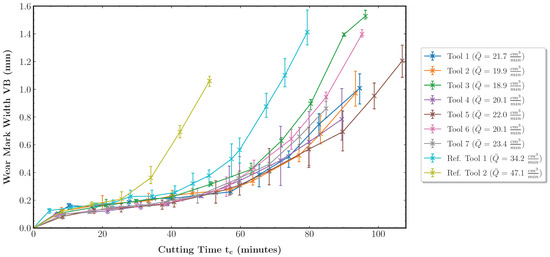 Following the methodology introduced in Section 4.2, the dataset is generated as a foundation for the evaluations performed in the following. In total, the data of nine tools are acquired over their lifetime. Figure 6 shows the measured wear curves of the tools. In addition, the average material removal rate according to Equation (5) is shown per tool. A discrete number of cutting time steps represents the tool life. The total removed material volume per time step is denoted as .