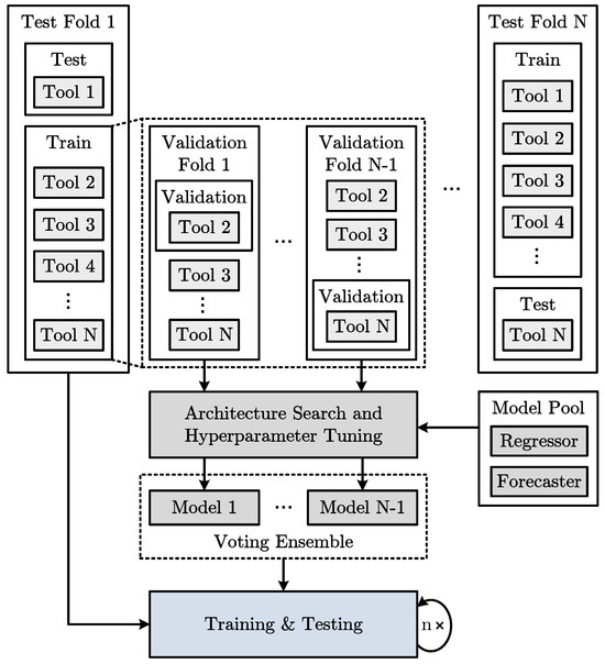 The data from N tools are divided into training and test sets to generate the regression and forecasting models. The data of a particular test tool are excluded from model training. Each tool is used once for testing to ensure that the prediction methodology is functional for arbitrary permutations and that its performance is not just based on the random selection of individual test tools. The model architecture and hyperparameter search are then performed based on the training set containing the data of tools. Model architecture and hyperparameter configurations are sampled from a model pool. When searching for the best configuration, a search criterion is required, enabling the evaluation of the configurations and their optimization. As with training, the prediction error can be used for this purpose. However, an additional validation tool has to be kept out of the training set. The evaluation of a model using the data of the validation tool guides the search.