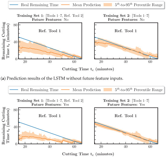 In advance, the evaluation of the remaining tool life prediction based on the previously trained regression component is performed. The goal is to analyze how the extension of the remaining tool life prediction model compared to the state-of-the-art method through the possibility of entering future feature estimates affects the predictions. For this purpose, the LSTM-based forecasting component, according to Section 4.3, is trained and tested using the data from tools 1 to 7. Based on the LSTM output, the remaining tool life is calculated using Equation (1). The forecasting component is first tuned and trained based on the LOTO-CVT strategy. The LSTM model has a single layer and a hidden dimension of 25. The length of the model input sequences between 12 and 60 samples and the output sequences between 1 and 36 samples is subject to the model tuning. Furthermore, the hyperparameters of the batch size in the range of and learning rate in the range of are tuned, guided by the MAE. An LSTM instance can train for a maximum of 30 epochs while early stopping is employed. In total, the training and testing of the models are repeated five times. In the testing phase, the outputs of the regression component shown in Figure 8b are input to the LSTM. Additionally, an exploration of non-spectral feature combinations as future feature inputs is performed. Figure 9 and Table 3 show the remaining tool life prediction results for the LSTM without future features and the best-performing LSTM with future features.