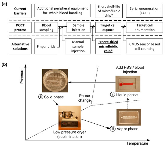 Overview of requirements and fabrication for a freeze-dried immunoassay microfluidic chip for point-of-care testing (POCT). (a) Overall steps for POCT. (b) Fabrication workflow: The freeze-drying process involves a sublimation phenomenon under low-pressure conditions to convert the liquid phase into a solid. (i) Immersing in liquid nitrogen, (ii) reducing ambient pressure, and (iii) initiating sublimation; the solid phase moves directly into the gaseous phase without transitioning through a liquid state (*, denotes substitutable device).