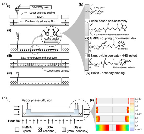 This figure presents a comprehensive analysis of the sublimation process in a fabricated microfluidic chip through numerical simulation and surface chemistry. (a) Shows the microfluidic channel geometry and parameters for sublimation, modeled using COMSOL Multiphysics® software, V5.0. (b) Illustrates the surface chemistry techniques used to immobilize target antibodies onto a glass slide. (c) Provides an overview of the design and modeling parameters for the microfluidic system.