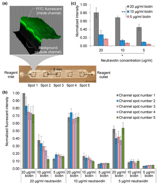Relative fluorescent intensity is quantified against background levels, specifically contrasting the channel interior and exterior. For three NeutrAvidin™ and biotin-FITC concentrations (5, 10, and 20 μg/mL), intensity is gauged at five different locations (Figure 3b). Values are normalized to the maximal intensity of 3500, observed at spot one with a 20 μg/mL concentration combination of NeutrAvidin™ and biotin-FITC. Intensity variances across the chip surface are marginal, with standard deviations ranging from 0.01 to 0.07, except at high concentration levels (20 μg/mL), where the standard deviations are 0.1 and 0.12. At such high concentrations, intensity dwindles from inlet to outlet due to surface conjugation saturation of the target molecule, biotin-FITC, with pre-immobilized NeutrAvidin™. Furthermore, the differences in fluorescence occurring at each spot can be attributed to the surface forces resulting from shear stress distribution in the fluid where laminar flow occurs, as well as the variables of diffusion (both temporal and spatial) from physical and chemical absorption during chemical reactions.