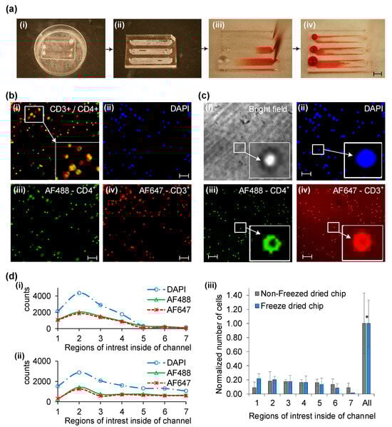 Comparing cell capture efficacy between a standard and freeze-dried microfluidic chip through whole blood injection, with assessment via fluorescent imaging and bright field cell counting. (a) Steps in utilizing the freeze-dried immunoassay-based microfluidic chip: first, the surface-treated chip is dipped in liquid nitrogen (i), followed by device reassembly (ii), whole blood injection (iii), and wash out (iv). Scale bar measures 5 mm. (b) Fluorescent imaging of captured cells after immunostaining on a standard chip includes overlay images for DAPI/AF488/AF647 (i). DAPI (ii), cell membrane antibody CD4+ with AF488 in green (iii), and CD3+ with AF647 in red (iv). (c) A set of fluorescent and bright field images (i) captured from the freeze-dried chip, showing cells labeled with DAPI (ii), AF488 (iii), and AF647 (iv). The enlarged image distinctly showcases the validity of three fluorescence staining: DAPI, AF488, and AF647. (d) Quantitative analysis of captured cells: cell count (i); freeze-dried chips (ii) using DAPI/AF488/AF647 markers; normalized cell counts (n = 6) (iii). Scale bars indicate 100 μm. The calculated p-values from a Student’s t-test based on two-sided distributions with equal variance show p * = 0.208, which is greater than 0.05, indicating a 95% confidence level.