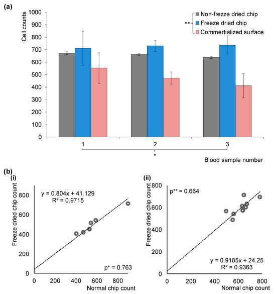 Comparing the efficiency of normal, freeze-dried, and commercially available non-specific protein chips in capturing cells from diverse blood samples. (a) Examination of cell capture efficiency across three chips with three different blood samples reveals no significant difference for normal blood samples (p * = 0.43), as confirmed via two-way ANOVA without replication. However, variances between chip types yield a lower p-value ** of 0.004, considered statistically significant at a 95% confidence level (α = 0.05). (b) Evaluation of correlation factors for different blood samples, using 12 microfluidic chips (i) and 18 microfluidic chips (ii), split evenly between normal and freeze-dried chips. Correlation factors of 0.97 and 0.93 were obtained for two different blood samples. Student’s t-test analyses, based on two-sided distributions with equal variance, indicate no significant difference between chip types for blood sample number 1 (p+ = 0.763) and blood sample number 2 (p++ = 0.664), both falling above the 95% confidence level (α = 0.05).