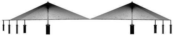 The focal subject of this research encompasses a long-span cable-stayed bridge in China. Illustrated in Figure 3 is the side-view depiction of the bridge, portraying its structural configuration. The bridge features a principal span of 1088 m in length, accompanied by two auxiliary side spans each measuring 300 m. To facilitate the monitoring of its operational condition and behavior, an advanced SHM system was strategically integrated into the bridge. The SHM system is equipped with a network of 16 accelerometers that continually record the vibrational patterns exhibited by the bridge. The spatial arrangement of these accelerometers entails the positioning of 14 dual-axis accelerometers on the bridge deck, with two additional dual-axis accelerometers affixed atop the two towers.