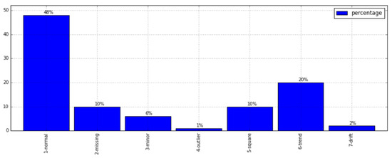 The dataset comprises a total of seven distinct classes, denoted as normal, missing, minor, outlier, square, trend, and drift. These classes are assigned labels ranging from 0 to 6, respectively. A comprehensive explanation of each of the seven classes is comprehensively outlined in Table 1. Illustrations depicting representative examples from each category of the dataset are presented in Figure 5.