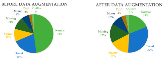 Within the dataset, the quantities of data instances within each category are succinctly summarized in Table 2 and Figure 6. Notably, the normal class emerges as the predominant category, while the instances attributed to fault categories remain relatively limited, particularly in the case of the outlier and drift classes. In particular, the data distribution across each category exhibits an inherent imbalance, potentially posing challenges for effectively training a high-performance classifier tailored for data anomaly detection. To address this concern, a data augmentation technique was introduced, specifically targeting the data instances within the fault categories. This augmentation strategy serves to amplify the instances within these categories, thus mitigating the effects of the existing imbalance.
