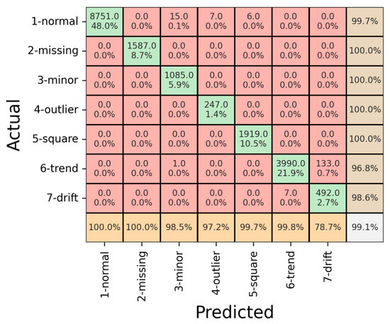 Figure 9 displays the confusion matrix regarding the training dataset. The model exhibited a notable overall accuracy of 99.1%, signifying its adeptness in learning and recognizing the prevalent patterns within the training dataset. Notably, the precision for the “Drift” pattern registered at 78.7%, suggesting occasional instances where the model misclassified other patterns as “Drift”. Conversely, the “Trend” pattern exhibited the lowest recall at 96.8%, indicating situations where the model struggled to identify the presence of the “Trend” pattern correctly. In the remaining categories, the precision demonstrates notable values, particularly in the range of 98.5% and above, including the normal class, and reaching a perfect precision of 100% in the missing class. Correspondingly, the recall metrics exhibit high percentages across the classes, with figures consistently exceeding 98.5%. Remarkably, the missing, minor, outlier, and square classes achieved a perfect recall of 100%.