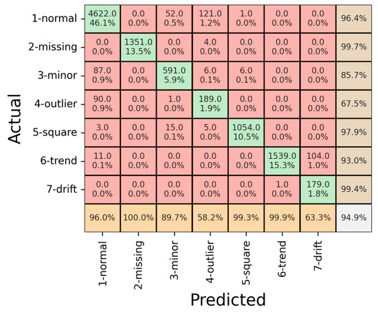 Figure 9 presents the confusion matrix depicting the model’s performance on the validation dataset. The achieved overall accuracy of 94.9% during validation confirms the model’s respected generalization capability to previously unseen data. Notably, the model exhibited variability in its performance across distinct patterns. Notably, the “Outlier” pattern indicated the lowest precision accuracy at 58.2%, implying occasional misclassifications of actual “Outlier” instances as “Normal”. Similarly, the “Drift” pattern displayed relatively diminished precision at 63.3%, with instances of misclassification of “Drift” patterns as “Trend”. Despite these challenges, the model displayed precision exceeding 89% for the remaining patterns. Regarding recall, the “Outlier” pattern again registered the lowest precision at 67.5%, indicating instances where the model erroneously classified normal patterns as “Outliers”. However, for all other patterns, the recall exceeded 85%. The outcomes of the analysis demonstrate relatively diminished performance in the identification of “drift” and “outlier” patterns. This observation can be attributed primarily to the scarcity of available data instances pertaining to these patterns, as visually depicted in Figure 7. In response to this prevailing data imbalance, we applied data augmentation techniques, resulting in a notable enhancement in classification accuracy. Nevertheless, it is important to emphasize that further bolstering the dataset with an increased representation of “outlier” and “drift” instances could serve to elevate the overall accuracy levels. Furthermore, it is worth noting that the challenges encountered in classification stem from the inherent similarity between “outlier” and “normal” data. In some instances, the model exhibited difficulty in distinguishing between these two classes, leading to occasional misclassifications.