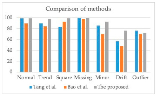 As depicted in Figure 11, our proposed method consistently demonstrates superior performance in most instances. Furthermore, the “outlier” pattern achieves the second-highest result, with a precision of 71.9%, followed closely by Tang et al. [21] with 76.8%. Upon close examination of the comparative results, it is evident that Tang et al. [21] secured the overall second-best performance, while Bao et al. [33] attained the third position in the ranking.