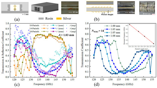 Specifically, the UV radiation in each exposure not only cures the resin within the top printed layer, but also leaks through the cured layer and solidifies some resin on the other side. Therefore, the resultant cumulative deformation has to be taken into consideration for the grating structure design, as it becomes explicit for prints where geometry changes rapidly from one layer to another. Additionally, the two-wire waveguide components were manually assembled from two complementary 3D-printed parts. When subwavelength features are superimposed on both parts, the postprocessing facet-polishing step can easily lead to their misalignments in practice. Furthermore, the optimal truncated ridge height was found to be ~0.2 mm, enabling a large bandwidth of the stopband, manageable loss in the passband, as well as the reproducible optical performance of printed WBGs (see Figure 1b).