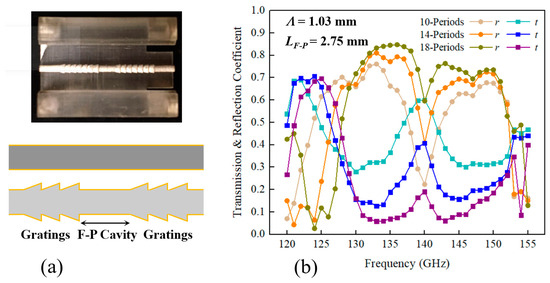 Phase-shifted waveguide Bragg grating. (a) Schematic and photo of a two-wire waveguide-based phase-shifted WBG. (b) Numerical transmission and reflection spectra of a phase-shifted WBG as a function of the number of periods, Λ = 1.03 mm and LF-P = 2.75 mm.